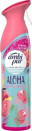 Ambi Pur osvěžovač vzduchu Aloha s technologií OdourClear odstraňuje nepříjemné vytrvalé pachy a zanechává lehkou svěží vůni. Vůně ve spreji jsou nehořlavé a obsahují 100% přírodní hnací plyn. Díky tomu se skvěle hodí do jakékoli místnosti v domácnosti. Osvěžovač Aloha Dragon Fruit & Lichee od značky Ambi Pur naplní váš dům od obývacího pokoje a kuchyně až po koupelnu a ložnici ovocnou tropickou vůní.