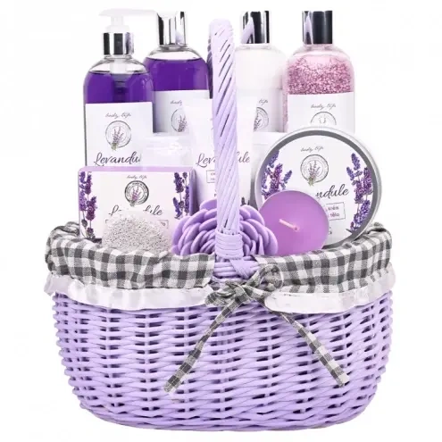 Krásné dárkové balení voňavé levandulové kosmetiky v proutěném koši. Dopřejte sobě a svým blízkým příjemné chvíle relaxace s kouzelným nádechem Provence.