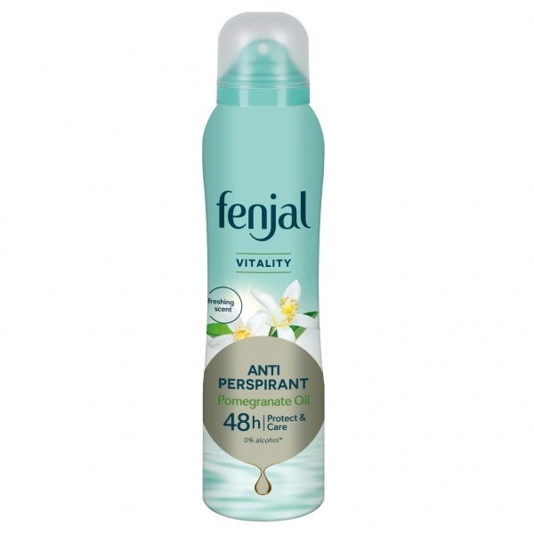 Fenjal Vitality - 48h spolehlivá ochrana proti pocení a jemná péče o citlivou pokožku. Obsahuje zklidňující allantoin a přírodní olej ze semínek granátového jablka. Minimalizuje bílé stopy na oblečení a chrání před vznikem žlutých skvrn. Neobsahuje ethylalkohol.