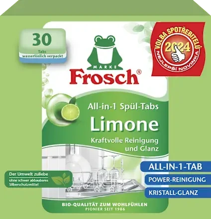 Účinná receptura tablet do myčky se silnými odmašťovacími účinky zanechá zářivě čisté nádobí se svěží limetkovou vůní. Díky přidanému leštidlu je nádobí vždy zářivě lesklé bez zaschlých skvrn od vody. Obsažená sůl zabraňuje usazování vodního kamene na nádobí i v myčce. Chrání sklo před trvalým zakalením v důsledku dlouhodobého působení vodního kamene. Nádobí z nerezové oceli je lesklé i bez leštění. Navíc podporuje proces sušení na konci mycího cyklu. Tablety do myčky od značky Frosch jsou účinné i při nižších teplotách. Tím snižují spotřebu energie a vody.