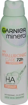 GARNIER mineral antiperspirant sprej Hyaluronic Care chrání před zápachem až 72 hodin a zároveň zklidňuje citlivé podpaží. Nezanechává bílé skvrny na těle ani na oblečení. Bezalkoholové složení je dermatologicky testované a na pokožce vytváří pocit pohodlí. Pro dlouhotrvající svěžest od značky GARNIER!
