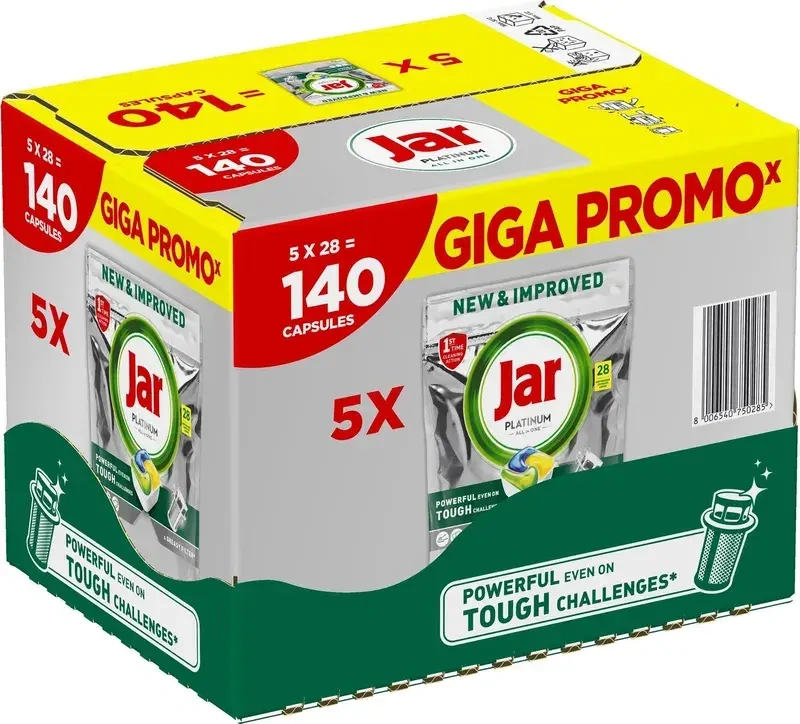 Usnadněte si práci a nechte mytí nádobí na myčce nádobí a kapslích Jar Platinum. Jejich účinné složení odstraní i ty nejodolnější nečistoty a navíc pomohou vyčistit i mastný filtr myčky. Tablety v sobě slučují tekutý i práškový čisticí prostředek v jedné kapsli. Součástí balení je 140 ks kapslí.