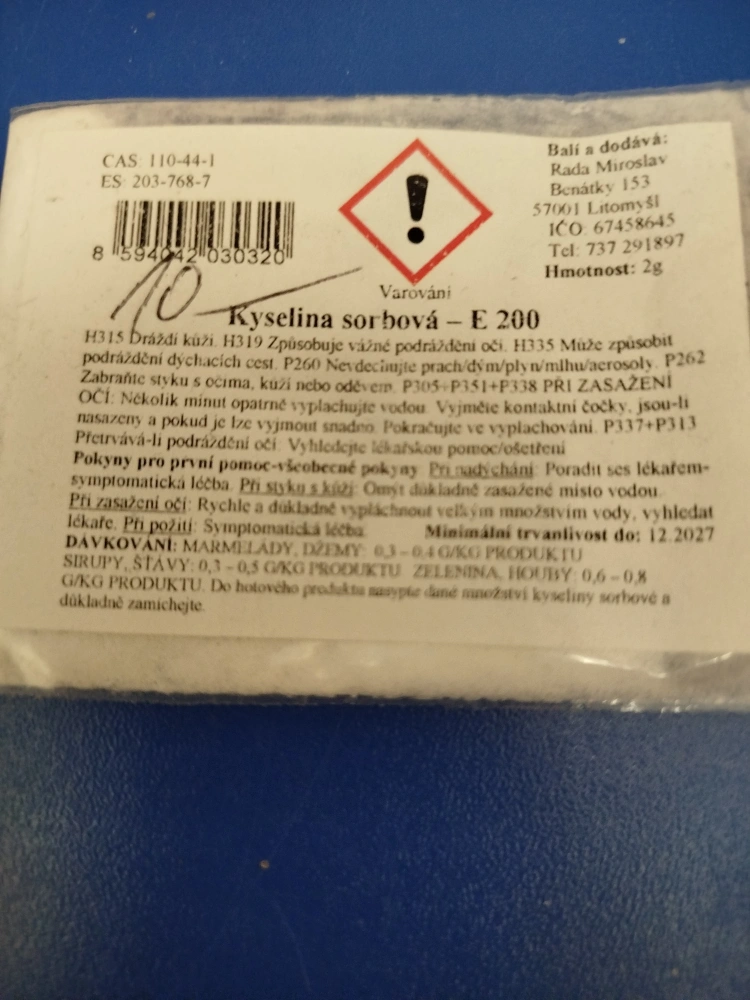 potravinářský konzervant k zabránění růstu plísní, kvasinek a bakterií, prodlužuje trvanlivost široké škály potravin jako jsou nápoje, sýry, marmelády, džemy, pekařské výrobky, kečupy, saláty, víno, sušené ovoce, margaríny, masné výrobky a nakládaná zelenina.