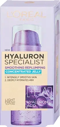 L'ORÉAL PARIS Hyaluron Specialist pleťový gel-krém je vhodný pro všechny typy pleti. Okamžitě pleť hydratuje po dobu 24 hodin a zároveň pomáhá bojovat proti vráskám. Vysokomolekulární kyselina hyaluronová pomáhá hydratovat a vyhlazovat povrch pleti. Nízkomolekulární kyselina hyaluronová proniká do pokožky a pomáhá ji vyplňovat hydratací. Dopřejte své pleti dlouhotrvající hydratační péči s Hyaluron Specialist pleťovým gel-krémem od značky L'ORÉAL PARIS.
