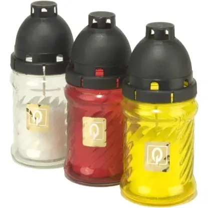 Hřbitovní svíčka ve skle s plastovým krytem určená pro venkovní použití. Před zapálením přečtěte instrukce na obalu. Výška 14 cm, obsahuje vyjímatelnou náplň o hmotnosti 60 g. Doba hoření je 15-17 hodin. Lze opakovaně plnit náhradními vklady o velikosti max. 75 g.