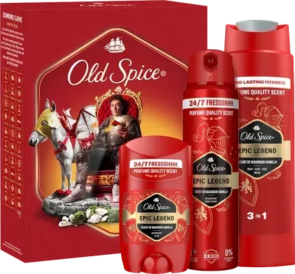 Dárková sada obsahuje tuhý deodorant, sprej a sprchový gel pro muže Epic Legend, vše krásně zabalené v kartonové krabičce s designem Knight. Kromě toho obsahuje hru domino, kterou si sestavíš sám: jednoduše vystříhej kousky z krabičky a užij si voňtastický okamžik! S vůní parfémové kvality Old Spice Epic Legend nemůžeš udělat chybu: vůně bourbonské vanilky, třešňového tabáku, kouřovou vůní dubového dřeva a horkého jantaru tě promění v legendárního rytíře svěžesti.